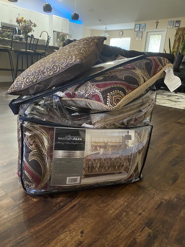 This Royale Jacquard Comforter Set with Euro Shams and Dec Pillows is a beautiful set. The style of this set is nothing be elegant. The weight of this set is heavy and will last a long time. It has a zipper insert so you can wash the inside in a washer as needed (outer layer is dry cleaned). The shams and pillows are a great addition to the set.