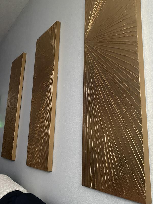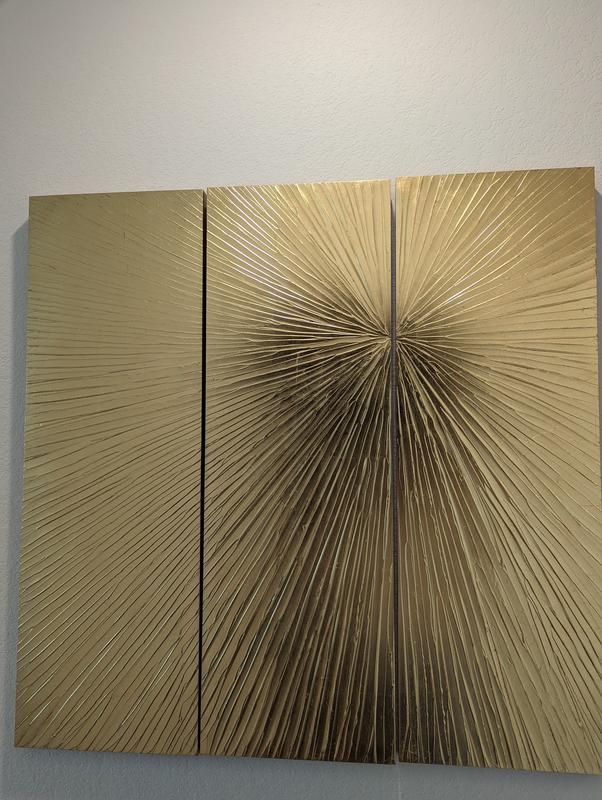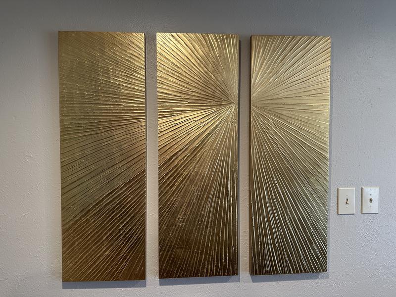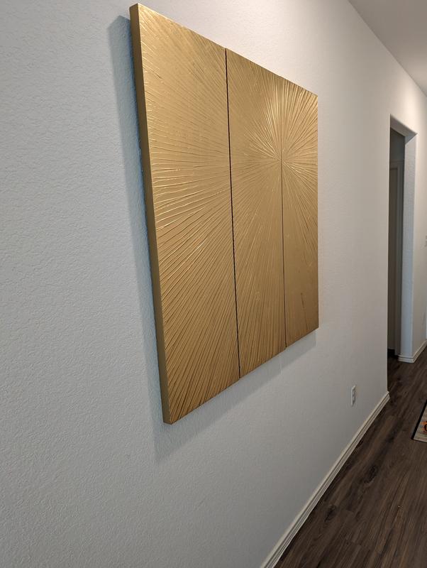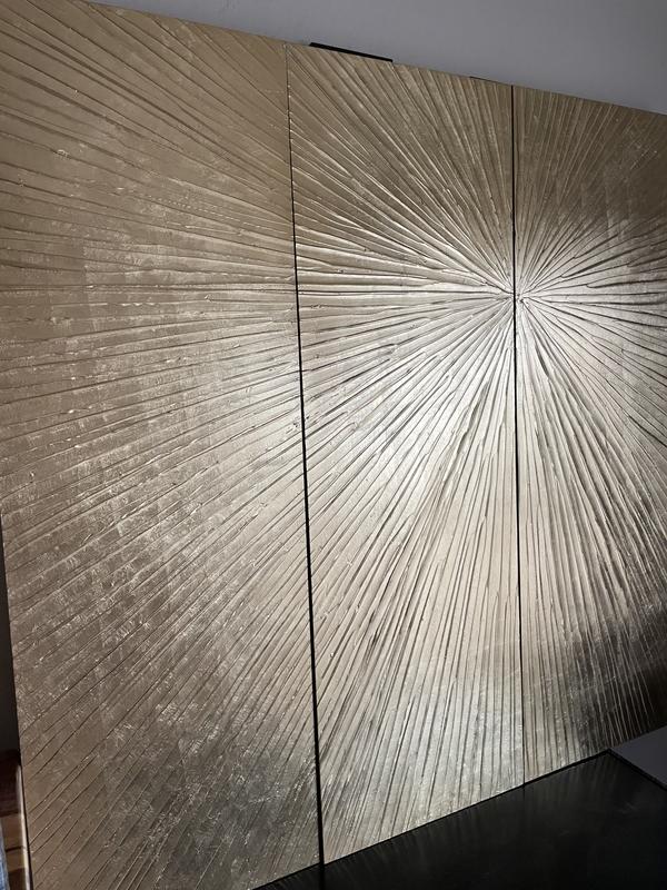 These starburst panels are beautiful! They are hand crafted and make the most beautiful presentation in my hom. It’s abstract without being loud. Like a quiet luxury piece. My homes color scheme is white and gray. This fits right in perfectly and elevates the room in its current design. I could see this working well in many home with even established design schemes. It’s stunning. Big enough to be a focal point of view but will not take over your room. I tried to capture the upclose detail of the design. It’s actually hand done and is actually textured! Stunning.