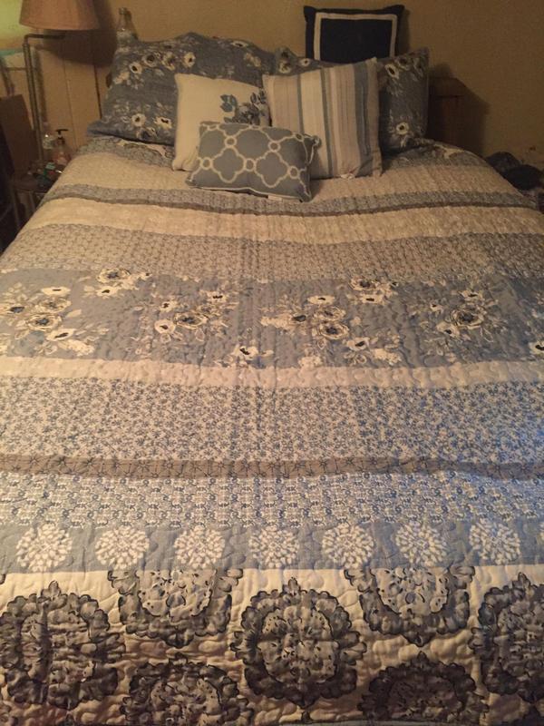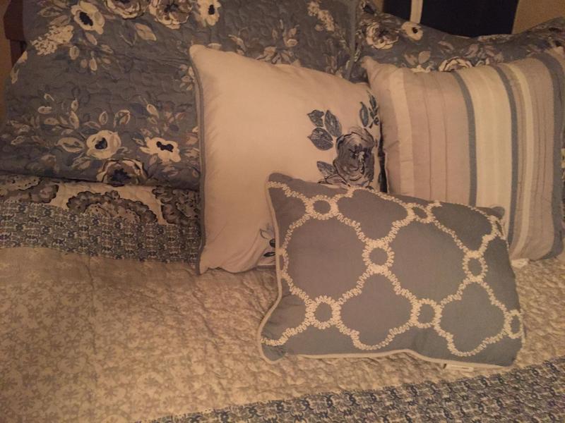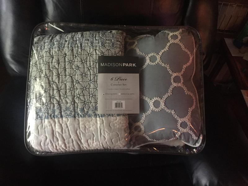 The Madison Park coverlet looks beautiful with its floral shams and three accompanying pillows. It looks so light and fresh. I painted the room a sea foam green to compliment the green in the coverlet. My bedroom furniture is an off white color, so the room now has a very peaceful feel to it.