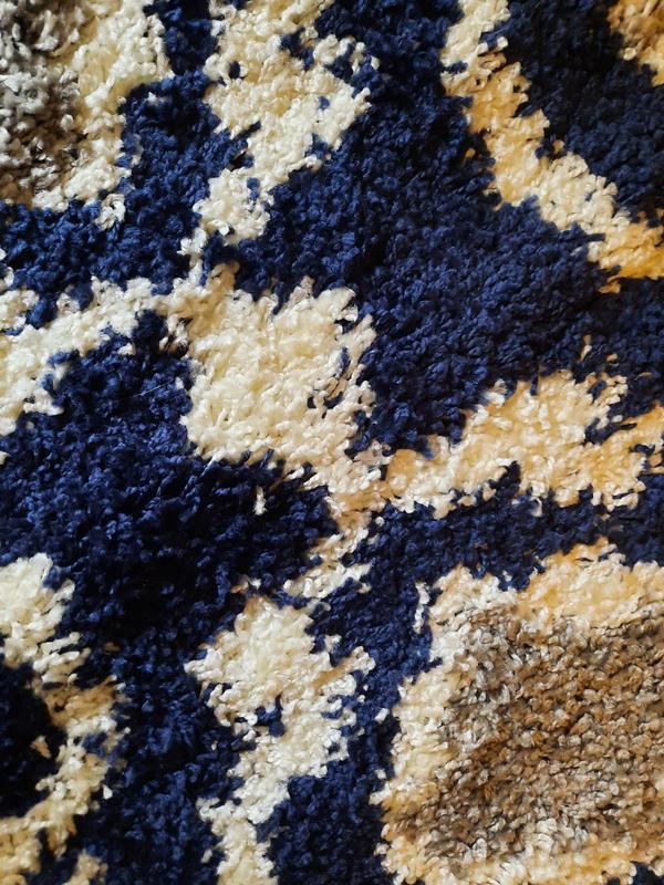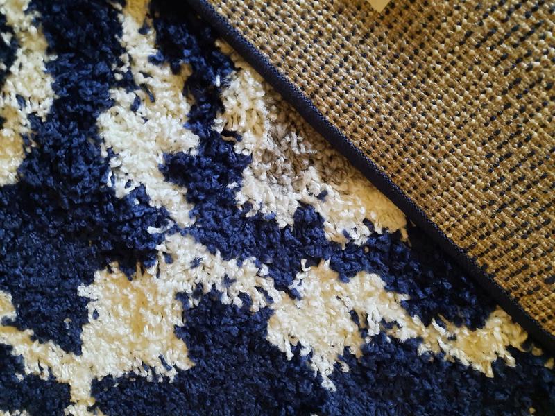 Attractive modern shag rug that I placed in my bedroom to soften the hardwood floors. I really like the navy, white & grey colors.