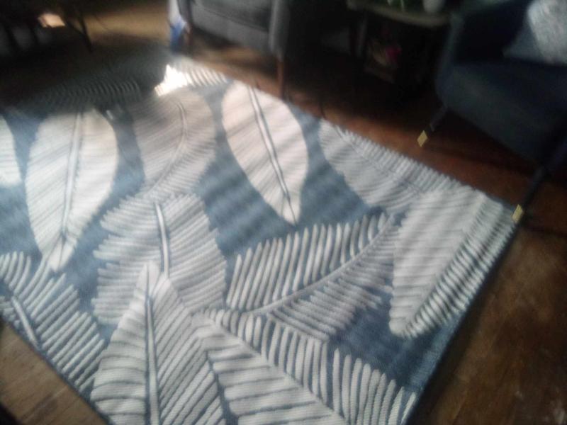 This rug is a nice muted blue color very close to the picture with fun palm leaves. Its a great size to block out a seating area in a larger space. The short/flat weave is also easy to clean.