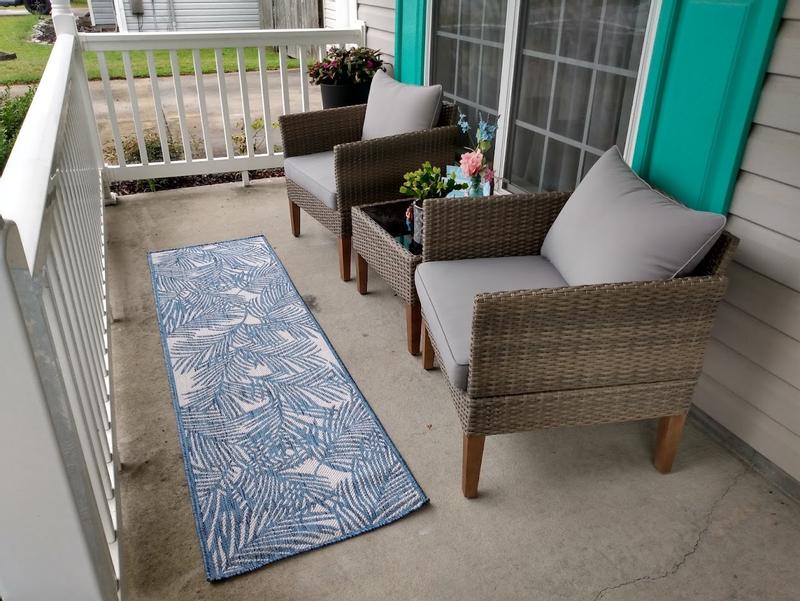 The blue World Rug Gallery Contemporary Palm Leaf Rug looks great on my patio by my pool. It is easy to keep clean and durable in the weather. I usually just sweep it off but it isn't very heavy, so when I need to, I pick it up and shake it out. This rug could be used indoors as well.