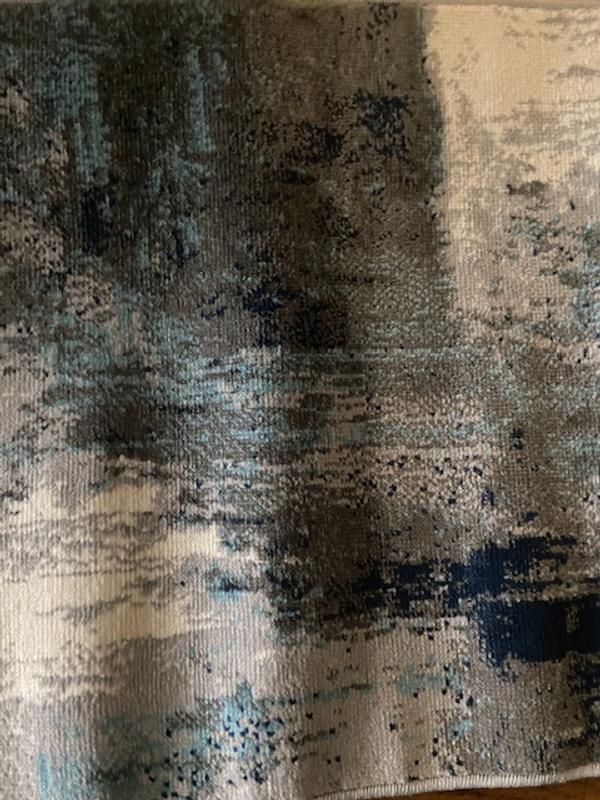 The small area rug is nicely colored with abstract grays and blue. It will be a nice accent rug in the laundry room.