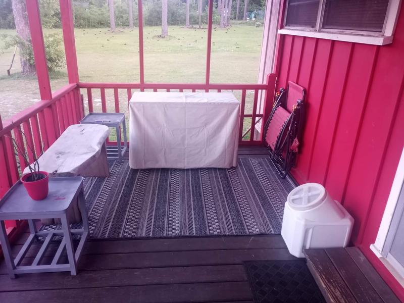 We have a large covered porch and this is the perfect accent rug for out there. The color goes great with all the blues I have on the porch. It seems to be wearing very nicely. We have a couple of cats and I was afraid that they might ruin it by scratching it, but so far it still looks great. I haven't seen either of them try and use it as a scratching post, so I can't be sure that they've tried, but so far it is still looking perfect and it's been out there for about two weeks now. I did unroll it (as it's rolled up with the bottom side out for shipping) and roll it back up with the rug side out for a few days to help it lie flat when we put it out on the porch. It is now lying nice and flat, no curled corners or anything. Very happy with it!