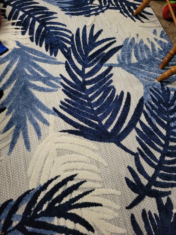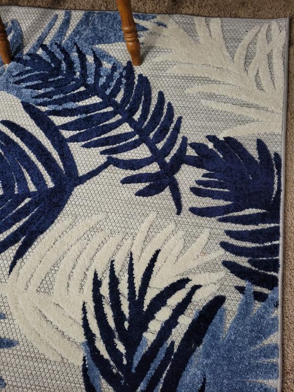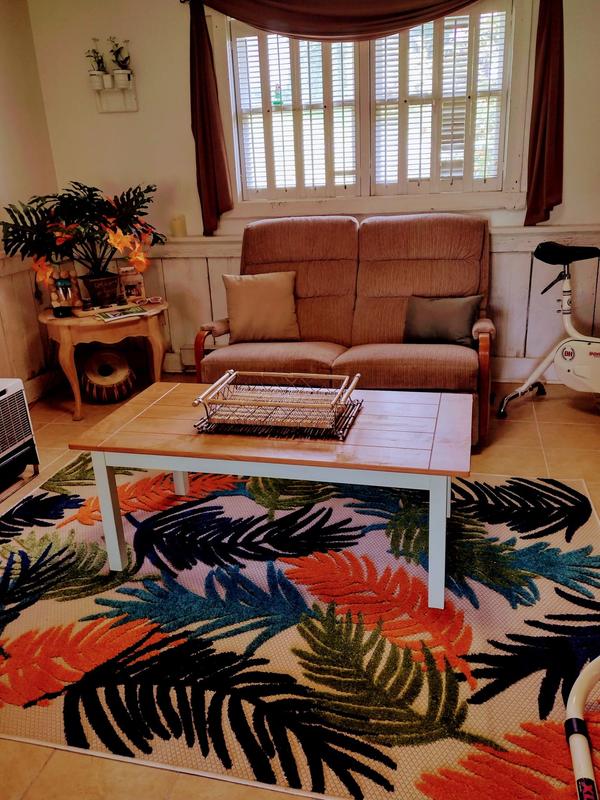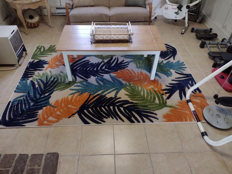 I love this rug! Now we need new chairs and a table to complete our outdoor patio. Super soft yet durable feel to this rug. Plush and colorful. Love the big leaves.