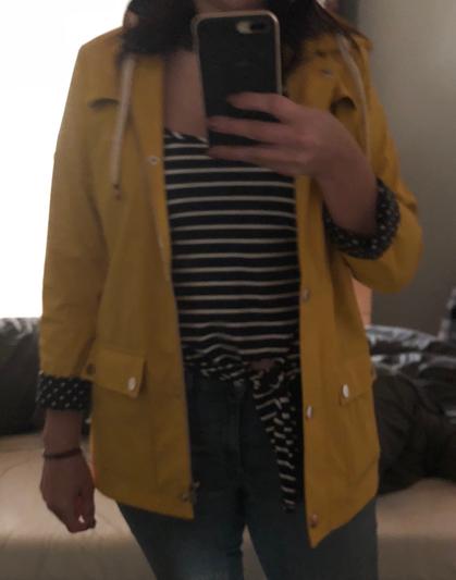 I saw this on the maniquin and had to have it. It was the last one and I was lucky enough that it was just my size. I put it on and fell even more in love with it. Even the yellow caught my eye. Great rain jacket!