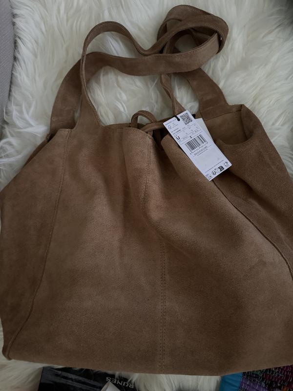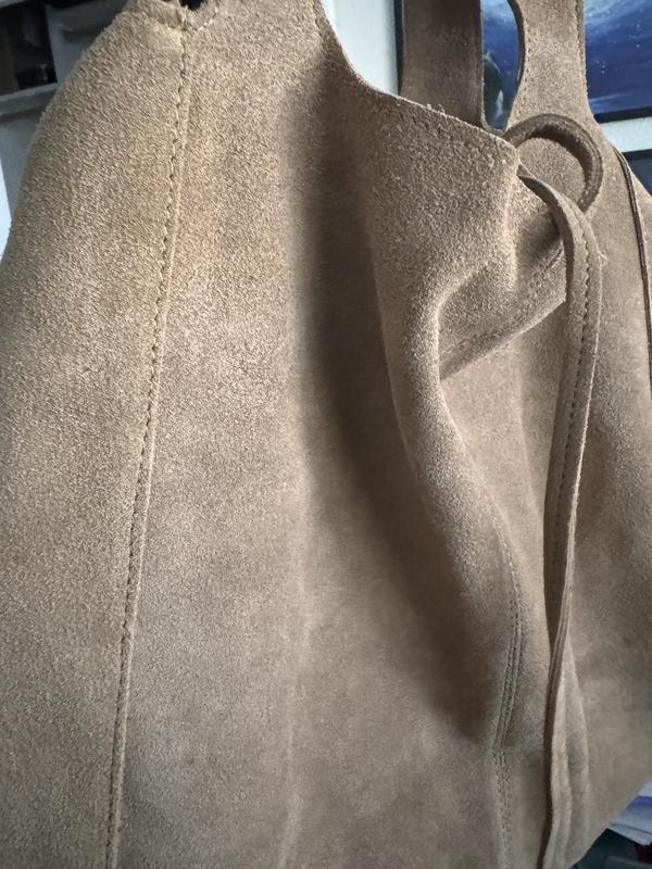 Brown suede bag. This is unstructured suede brown bag. Very slouchy. Has no inner padding to hold it up. It’s a great small tote style. Easy to carry laptop and several daily essentials. Very compact light weight. Pretty and simple. But a bit pricey for such simplify. Genuine suede and color is trendy