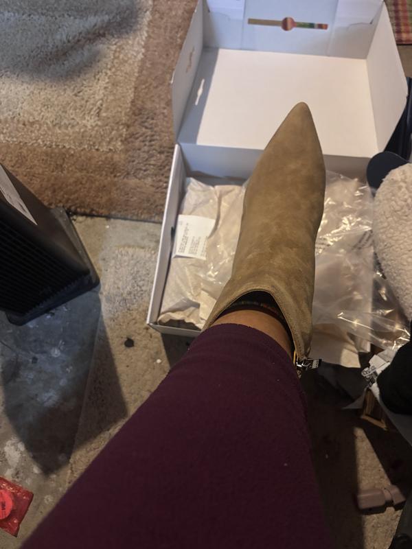 I have slightly wide feet and size up from 6.5 to 7 and the shoe fits very well and doesn't feel squeezed in. Also, I feel the shoe is ready to wear and doesn't need breaking-in at the heels due to the soft and flexible suede fabric. I have a wide calf, and the shoe opening is slightly loose and may need breaking in as it rubs against the skin when walking. If you have a regular/skinny calf, then the opening may be loose on your legs. The shoe doesn't feel very pointing. I plan to get this shoe in other colors.