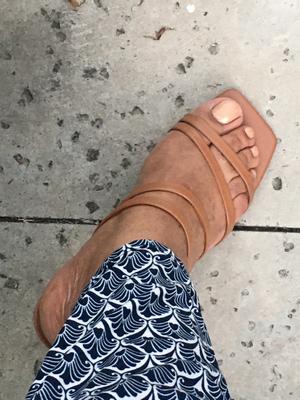 I purchased these shoes to go with a maxi dress. I was hesitant because they aren't leather. When they arrived I fell in love. You absolutely cannot tell these are manmade materials. The heel is funky and chic. Very nice dressy sandal that looks fantastic with the dress I purchased them for.