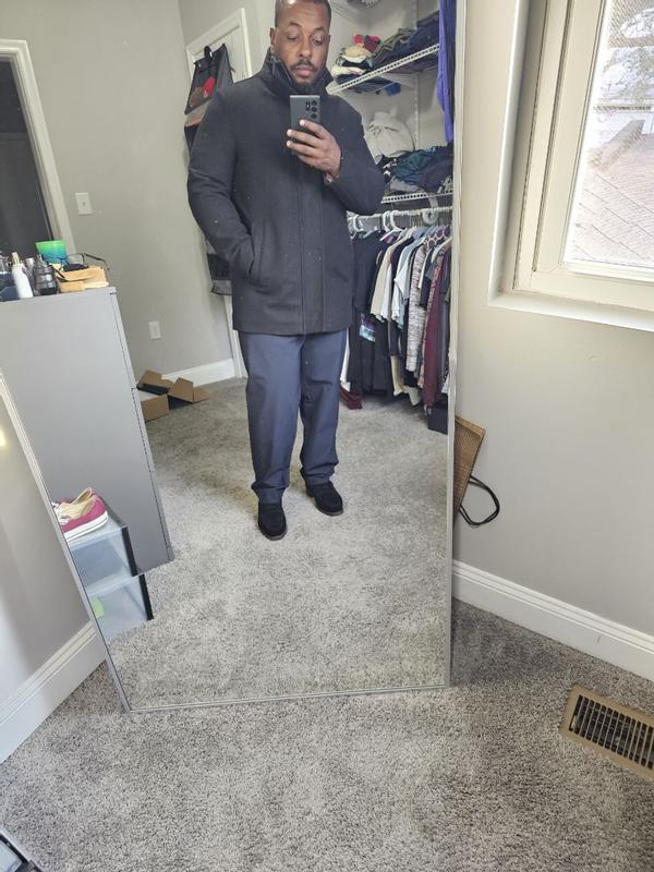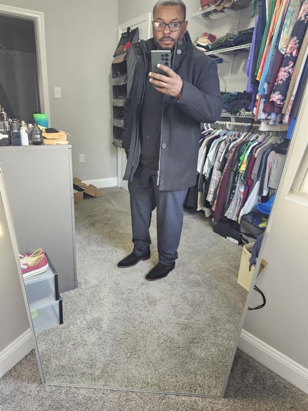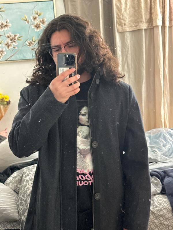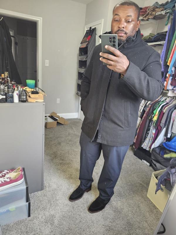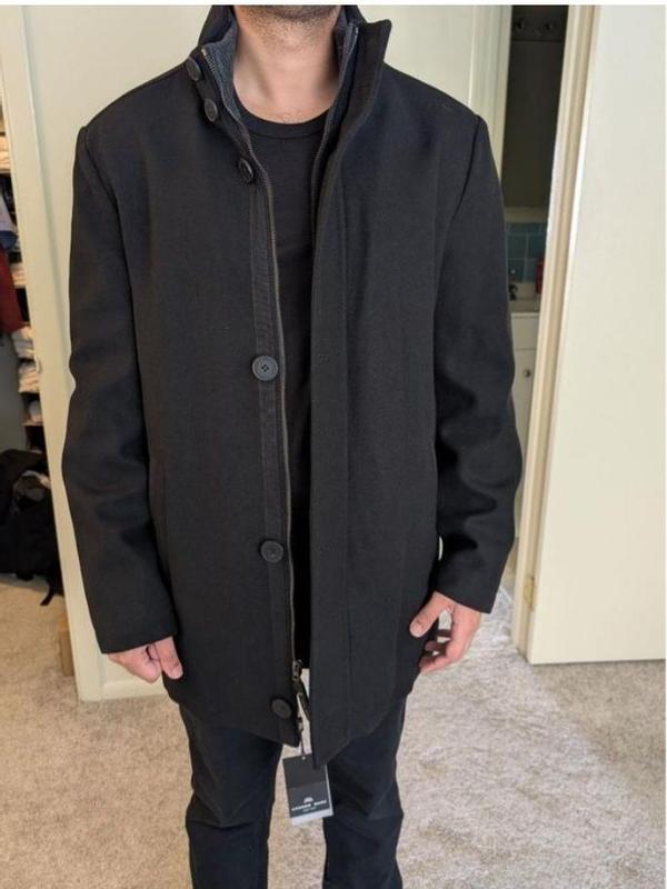 Looked for a coat for my husband that he could wear to work over dress clothes or jeans, and that he feels more confident in. This was it. He’s a large in everything, but the large was way too big. You must size down. A heavy coat, well made, classic and elegant look. This coat gives, confidence, and clearly shows a man that knows what he’s doing. Men, go for the stand collars like this one. It will impress your audience. It’s a coat that shows u have great taste, style, and that you belong on the cover of a GQ magazine. My husband loves this jacket. The medium fits him perfect and he leaves the house feeling like a million bucks. A winner all around.
