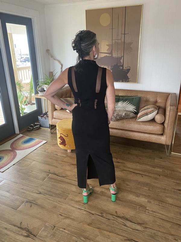 I’m a 34A with broader shoulders and a straight body type. The size S fit great. The arm holes are well sized (not overly large like some dresses) and the sheer panels on the dress are placed just right so that you can still wear a bra without it showing! The material is pretty stretchy and very comfortable.