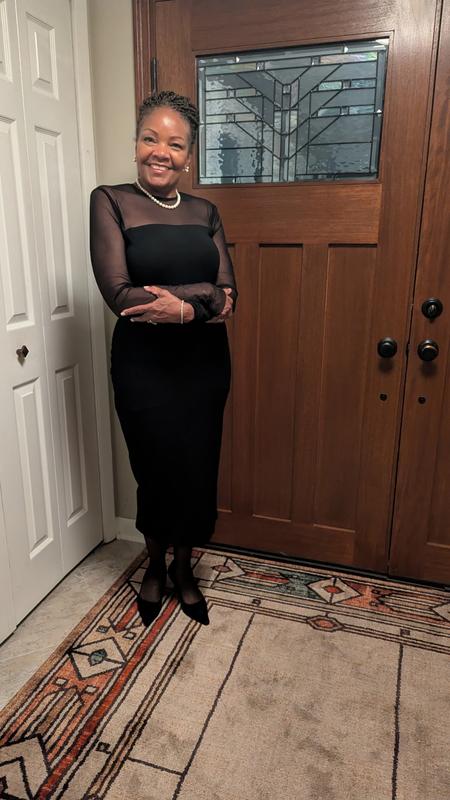 Perfect dress for almost any occasion. Fabric is great and the sheer arms are sexy without being bare. A must have!!