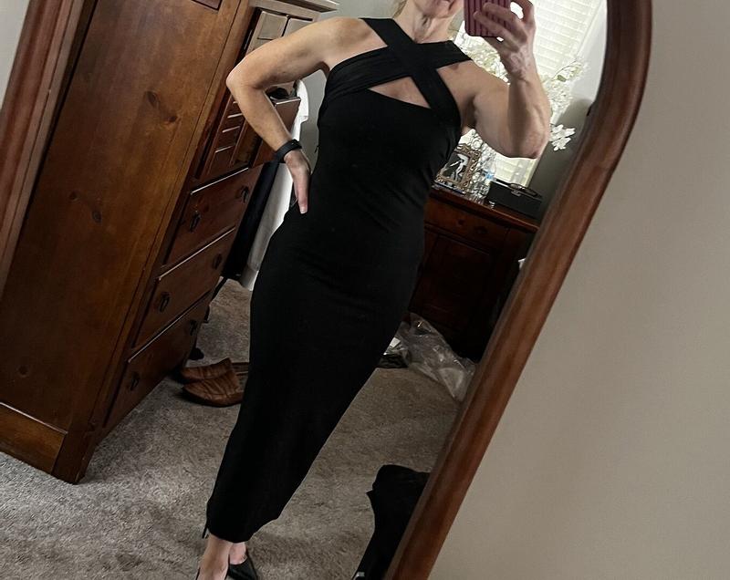 This is a beautiful, well constructed dress! It hugs the body in all the right places and is soft and comfortable. It looks very elegant! According to the size chart, I was a small. The small was a little loose up top and overall just skimmed the body. I preferred the XS. The chiffon at the top was more taut and the stretchy fabric cinched the body better. For reference, I’m 5’4” and 129 lbs. The length was great.