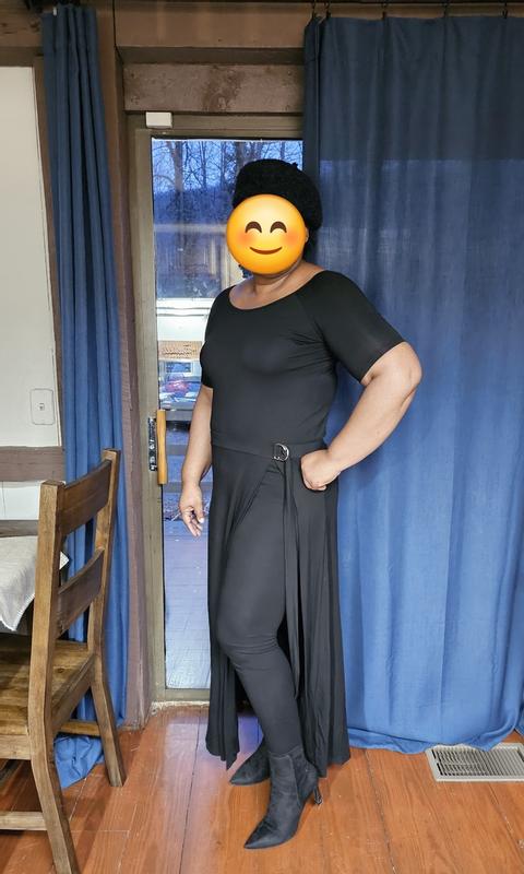 Love the look and how the fabric drapes. The belt is pure decoration so I leave it long. I think it'll be the perfect chic and modest solution to traveling in leggings. The xs legs seem a little loose, not typical for athleisure leggings, but I expect the material will shrink a little with washing. The waist to me seems very high and smaller than I'm used to - hope it doesn't shrink there. The ankle length is great even in bare feet so I'm not tripping over the skirt. It was a little disappointing that the price dropped 11 days after I purchased it.