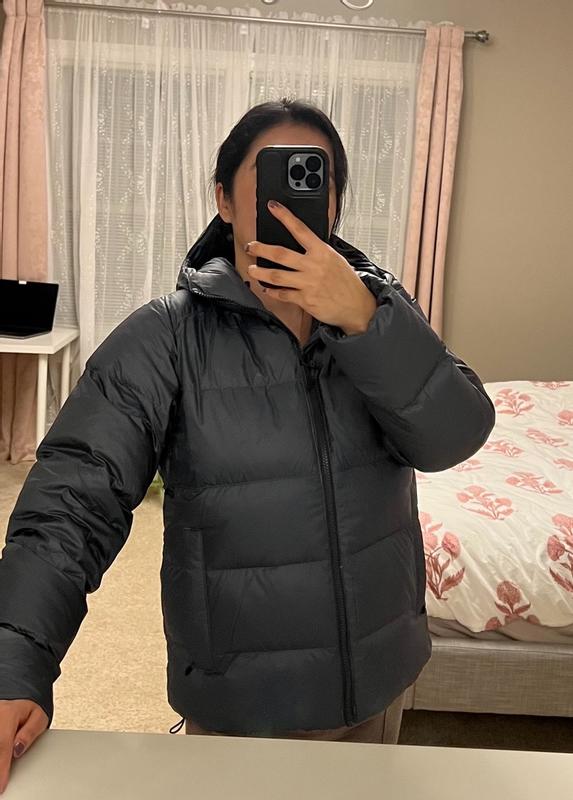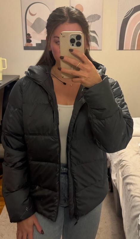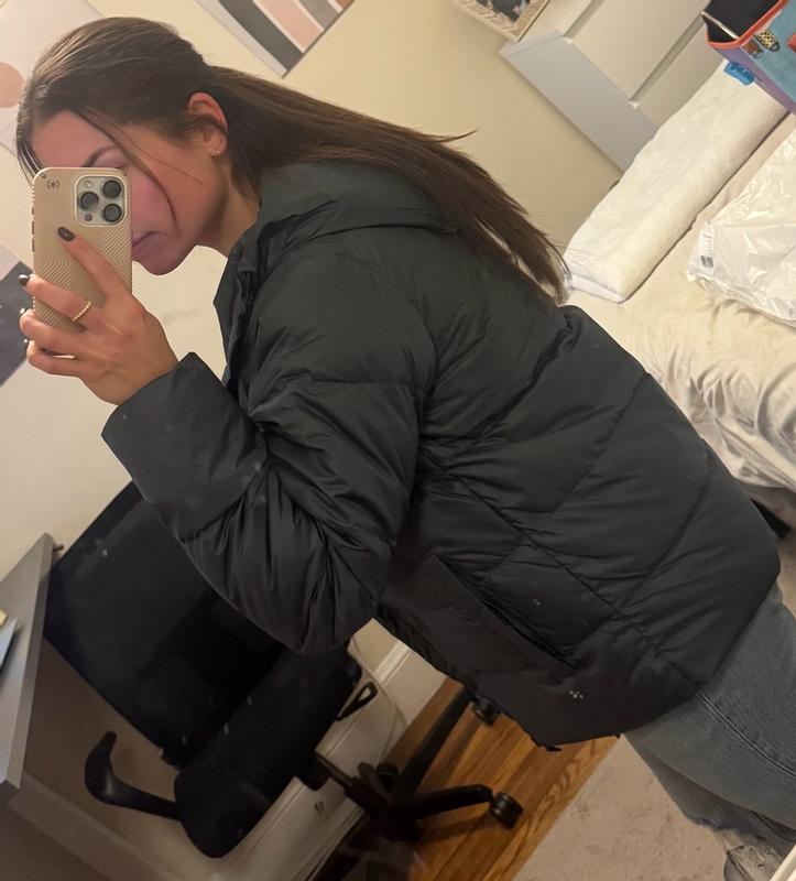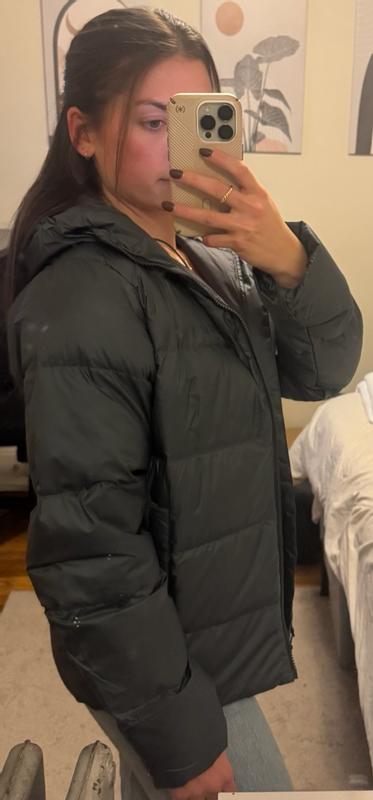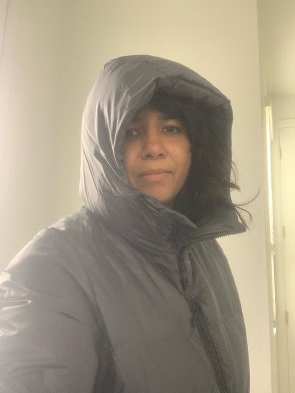 One of the most comfortable puffers! It’s very light while keeping you warm. The grey color fits everything. It’s durable & the perfect length!