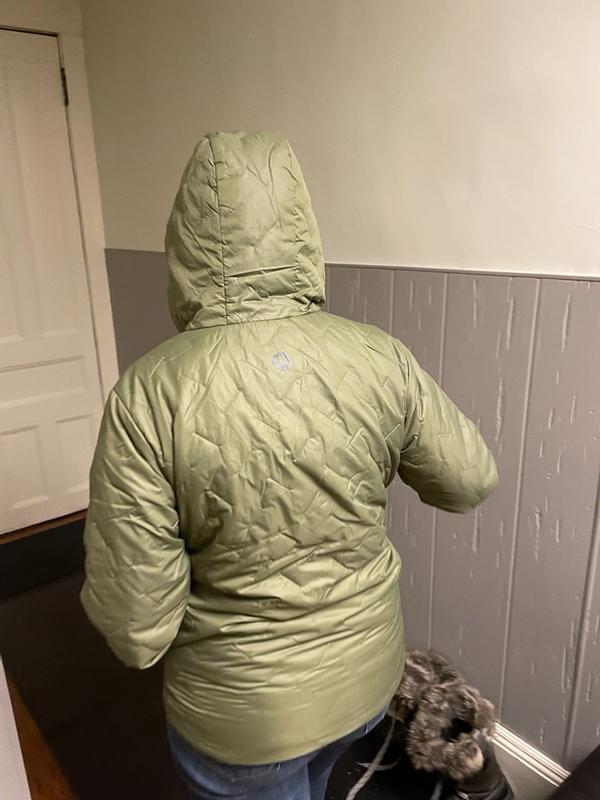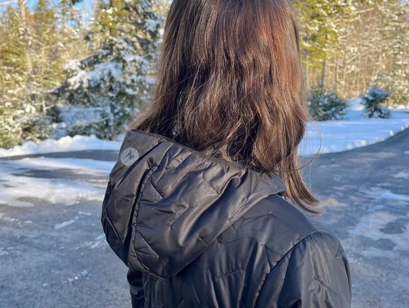 This is a great zip up hoody-style jacket that’s extremely versatile. When it arrived, I didn’t think it could be my coat because the package was so lightweight. I honestly was a little turned off because I was worried about how thin it felt. This jacket retains heat very well, but it also breathes so you won’t get sweaty. I love that the hood is so thin because it lays flat and doesn’t make your hair go crazy. The hood also keeps you very warm while wearing it. You can wear this by itself and stay very warm, or you can layer it under a ski coat or something similar for extra, lightweight warmth. Zippers are smooth and elastic adjusters are featured around the waist for a custom fit. Another awesome feature is that if you unzip the left pocket, the entire jacket fits inside. Once zipped up, a hanging loop is provided for travel. This feature is not mentioned on the hang tag, but I had read it online and verified it in my photos. This is a high quality jacket that is versatile and thoughtfully designed.