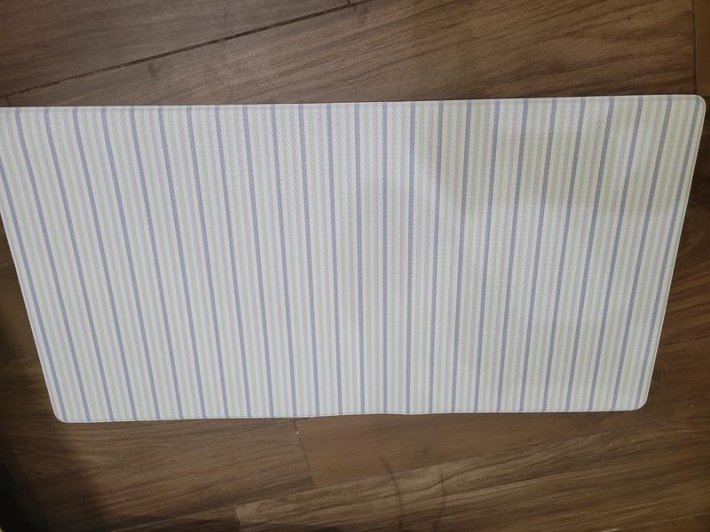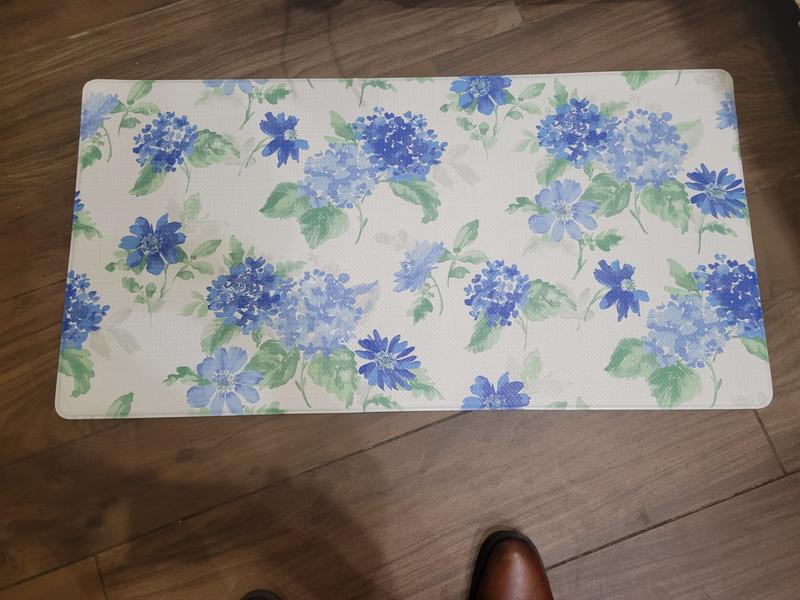 Very impressed with this Martha Stewart kitchen mat. The quality is very nice. The mat is very well cushioned and easy on the feet. It is made of 8mm foam and is thinner than I had expected. However, I much prefer this thickness as it is not as thick as a memory foam type floor mat. I like this thickness as it doesn’t look as bulky while still providing sufficient cushion for my feet. I like that the mat is reversible so I can flip it over and change the style up. One side is a blue, floral/hydrangea type print and the other side is a multi-blue toned stripe print. It’s a great kitchen mat overall. At nearly 20x30 inches, this mat was the perfect size and long enough to fit in my kitchen sink area. The mat is PVC coated so it is water, stain and oil resistant. This makes it very easy to wipe any spills and keep the kitchen mat clean. Overall, this is a high quality mat that will add comfort if you spend a lot of time standing in the kitchen.