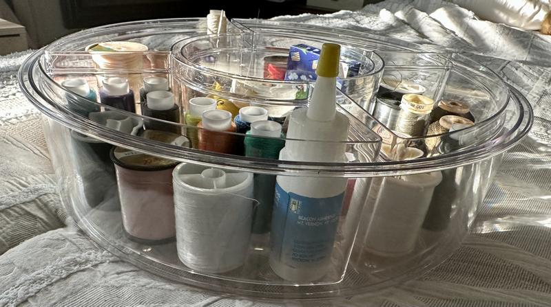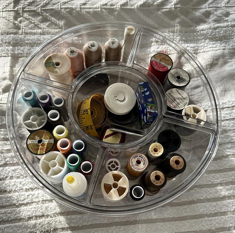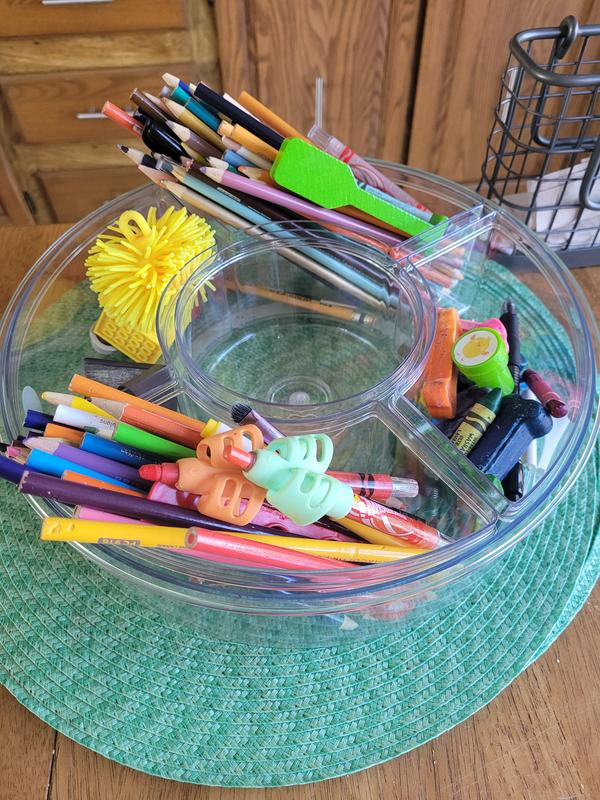 As a homeschool mom and small business owner life can get pretty hectic. I was searching for something to help me be more organized and functional. When I came across this divided lazy Susan I knew it was worth a shot. This did not disappoint and has been a total game changer!! I love how it has different compartments that come out easily. For example, when I’m working on earrings for my business I like to put each design in a different compartment so when it’s time to assemble I just go over and take only the bin with the type I need this way it’s all together and less of a chance of my 1 year old grabbing everything. When we do homeschool my daughters can go over and grab the cups they need for the specific task we are doing. It’s about the size of a medium pizza, but it’s functionality helps in the everyday so much!! I highly recommend this divided lazy Susan!