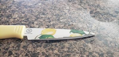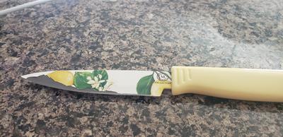 The design / paint is chipping off of the knife blade. This is unsafe for consumption purposes. I was slicing cucumbers and adding to a salad when I noticed.