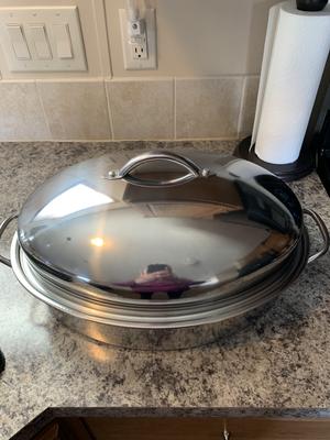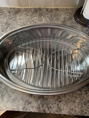 Nice large roaster with lift out rack. Only wish the lid could store upside down in pan to compact.
