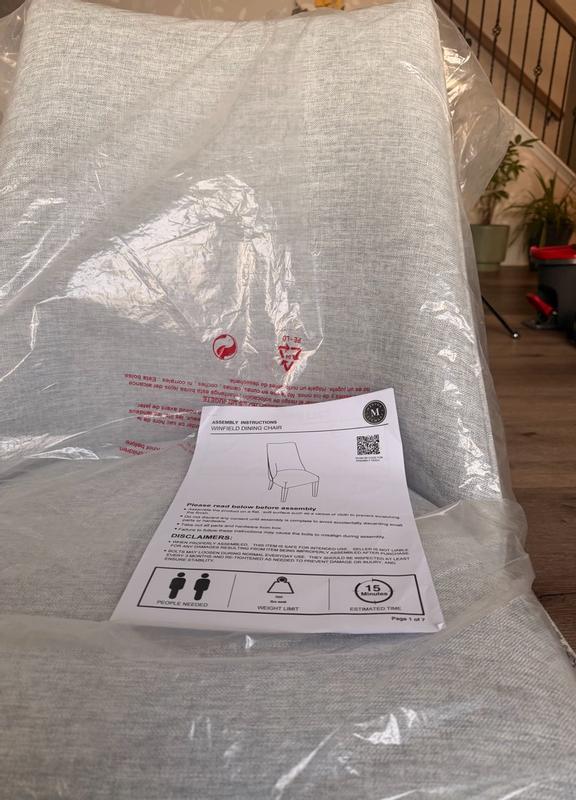 These two Winfield dining chairs are heavy in weight. But eventually, they are pretty simple to assemble, and no additional tools are required. They come with all the parts and hardware, including an Allen wrench. It took me less than 15 minutes to install the legs, but one leg took extra time because there's a piece that's blocking the leg area, and I couldn't get the holes to match. Nonetheless, I get it to match after using serveral methods. Moreover, the chairs are great in quality and sturdy. The cushions are soft and comfortable to sit on. The fabric surface is smooth and nice to touch. The color is natural, and the design is modern, which adds a better sense to my house. Overall, I'm satisfied with these chairs and enjoy sitting on them.