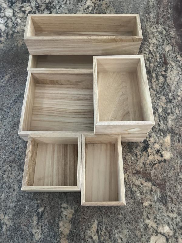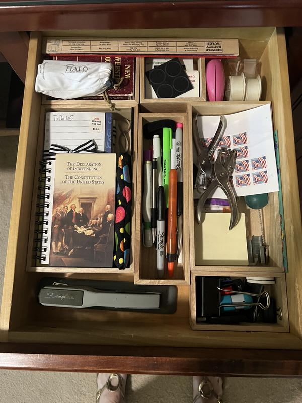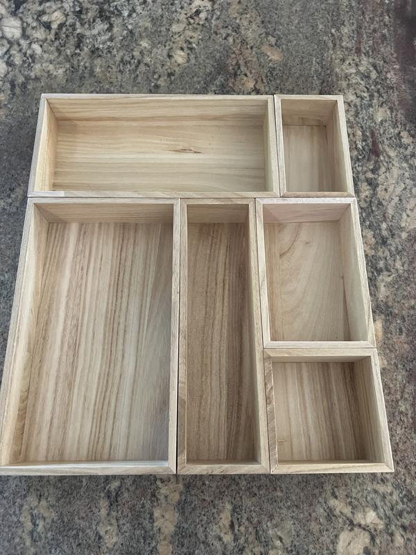 Thank you so much for your positive 5-star review! We're thrilled to hear that our organization set has proven to be a great addition to your drawers. It's wonderful that you find the light wood both attractive and sturdy, and we're pleased to know that the customizable arrangement works well for your needs.
