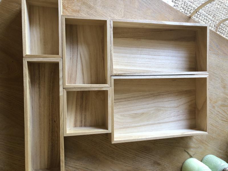 This is a nice organization set for my drawers. The light wood is attractive and sturdy. You can place them in any order you like that works for you. They fit in the drawer really nice and keeps everything in place and easy to find.