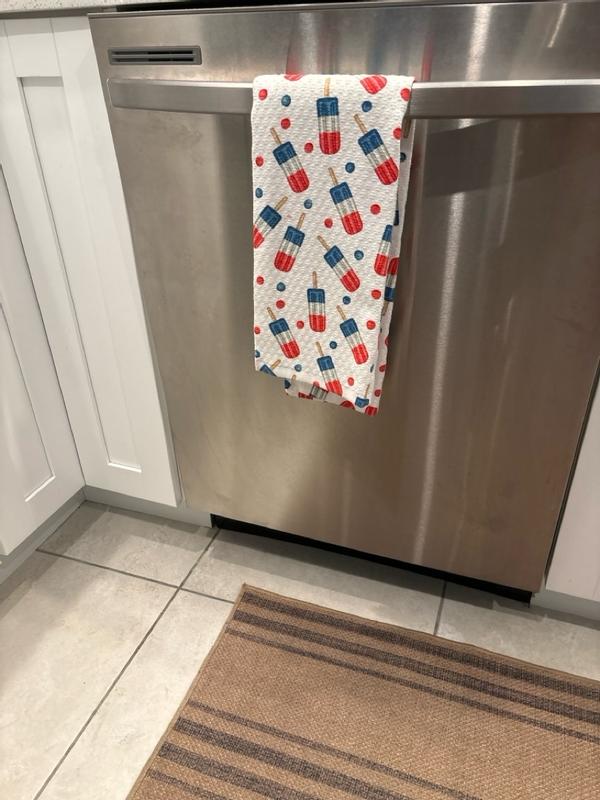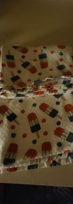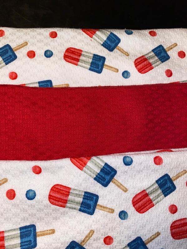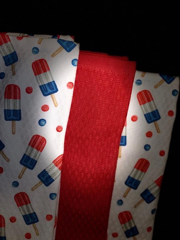 The towels came in a 3 pack, 2 popsicle prints and one red! The red one complements the printed one nicely and is nice to have out for actual use (since won’t show stains as badly). I like the popsicle print because it can be left out all summer and not seem too 4th of July themed. They are 100% cotton so they absorb moisture well!