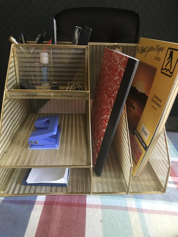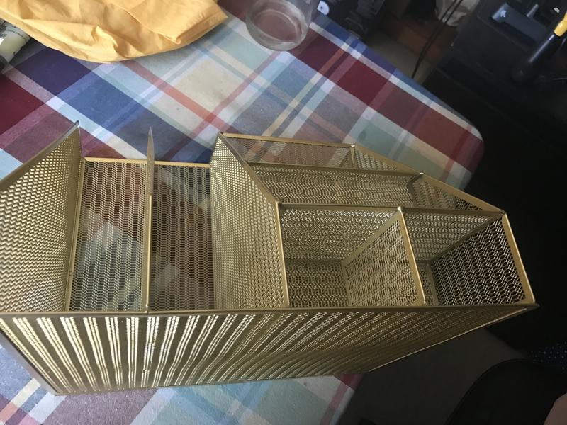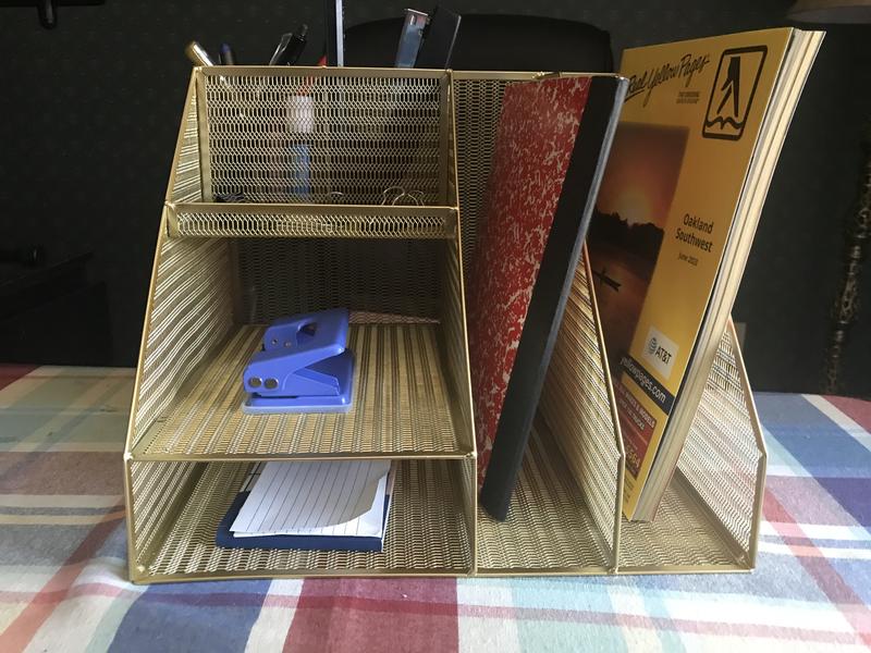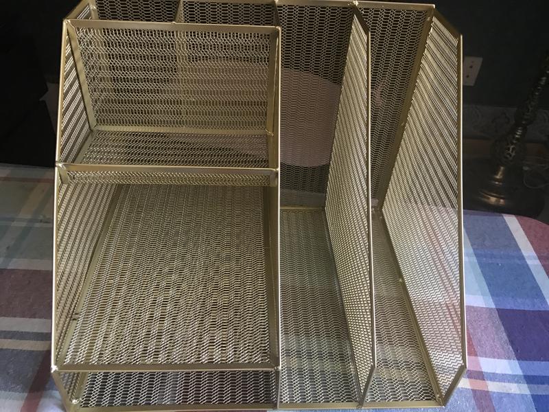 This Ryder gold mesh metal large desktop organizer with magazine file holder, pen holder, and Storage looks great on my desk. It's a great space saver. Holds a lot. I love that I can find what I need with the different slots. It's very sturdy. My desk now looks stylish and clean.