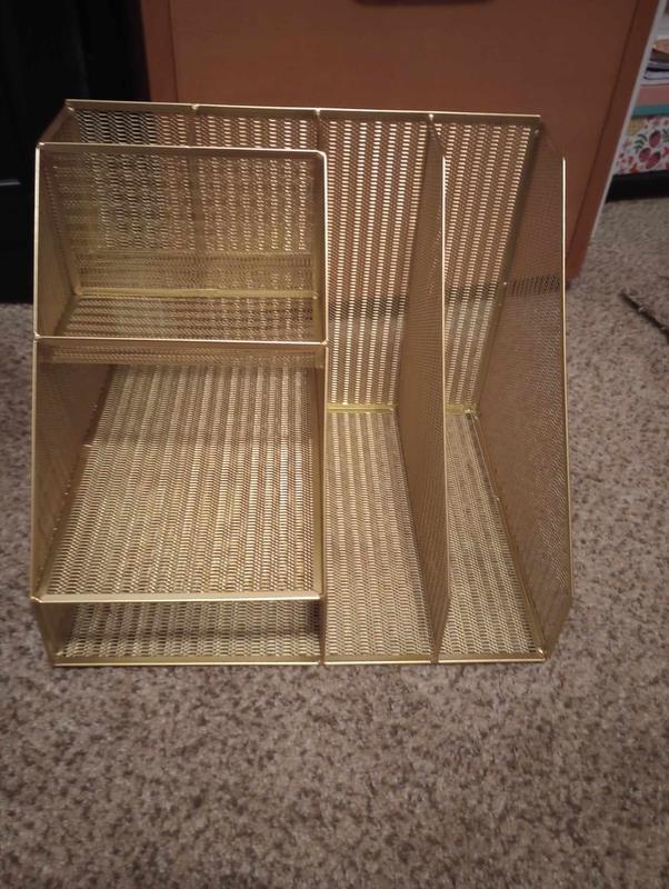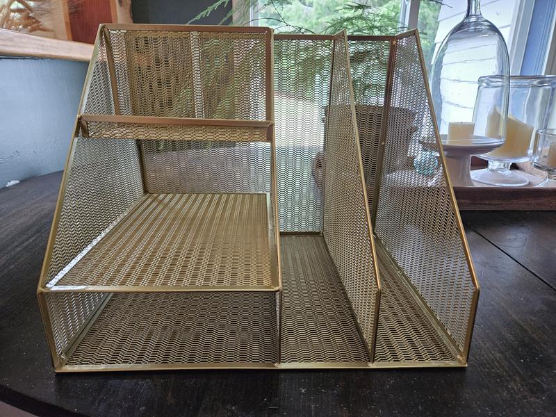 I absolutely love this organizer! It's perfect for mail and magazines as well as print outs and paper work. The trays are just the right size for pens, envelopes and other office supplies. The gold color goes perfect with my desk and office decor. It would also make a great gift for a spouse, coworker, etc.