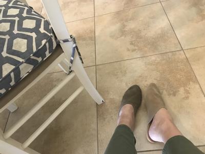 I love these mules and they actually have some cushion in the foot bed! From the photo I figured there would be no cushion at all but they are so comfy! They do run a whole size big so I had to send my usual size 7 back and get the 6 and they are perfect, no half sizes available. This is the reason I took off one star. I bought the light beige and they go with everything.