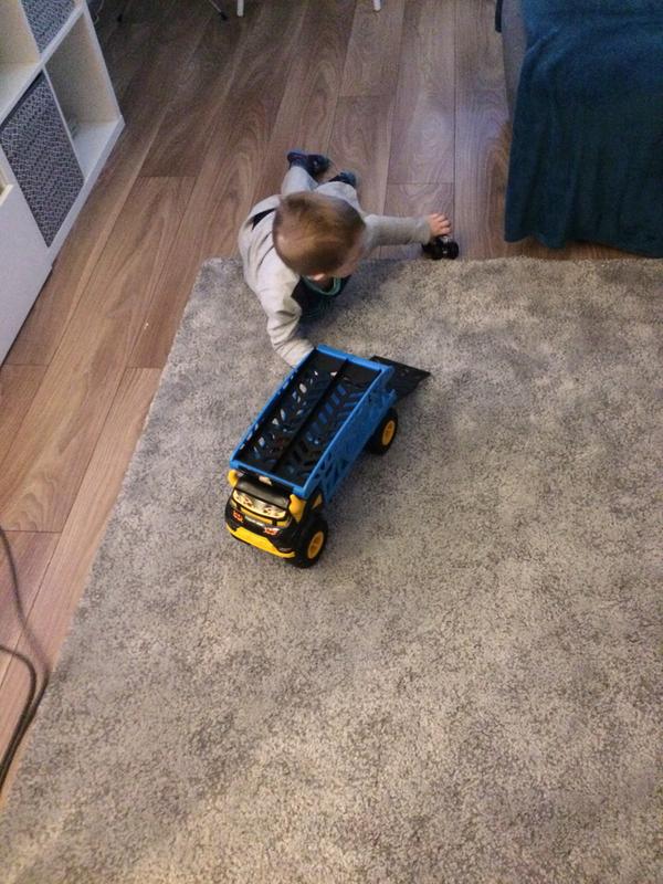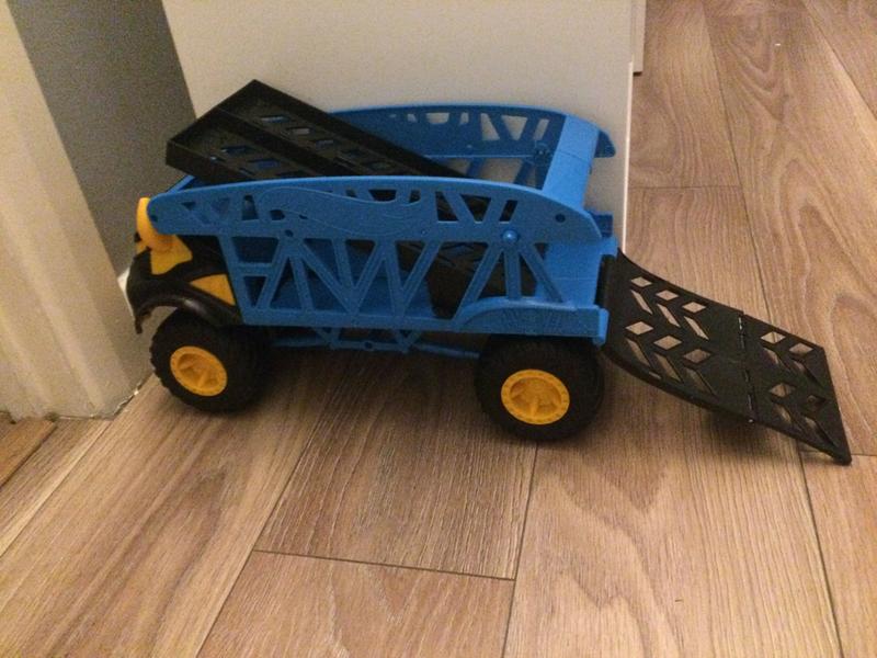 I received this for my children to try out and from first look this one was a winner, was easy to get out of the box and the 3 trucks that were included were a great start to my boys new hot wheels collection. It has 2 levels which fits lots of cars and the trucks, my boy put his normal hot wheels cars in and they fit also. He loved the truck the blue, yellow and black colour and design are great and the flick bit at the bottom that shoots the cars and trucks out of the ramp provided hours of fun! The ramp at the back clicks in and out so if you just want to store you cars or trucks in there there’s plenty of room. All in all a great toy which will provide hours of fun for my little boy and girl!