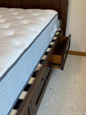 I ordered the Queen Bed in 2019 but decided to wait to write the review and see how it goes. I love the bed, it looks very Classy and Modern at the same time. Storage Drawers are very deep and run smooth. The Queen Mattress I got from Macy’s is smaller than the bed so the Slats are visible all around and since not stained, so doesn’t look good. I suggest they should be stained the same as the bed. I went ahead and ordered 2 Full beds for my Grand daughters and they love their beds.