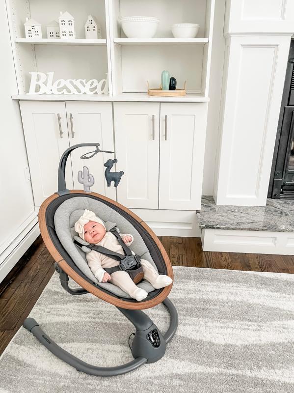 We absolutely love this swing. It's so beautiful to look at and looks great in our home! Our newborn loves to relax in here. The automatic swinging movement when he begins to fuss is so handy when I'm busy around the house!