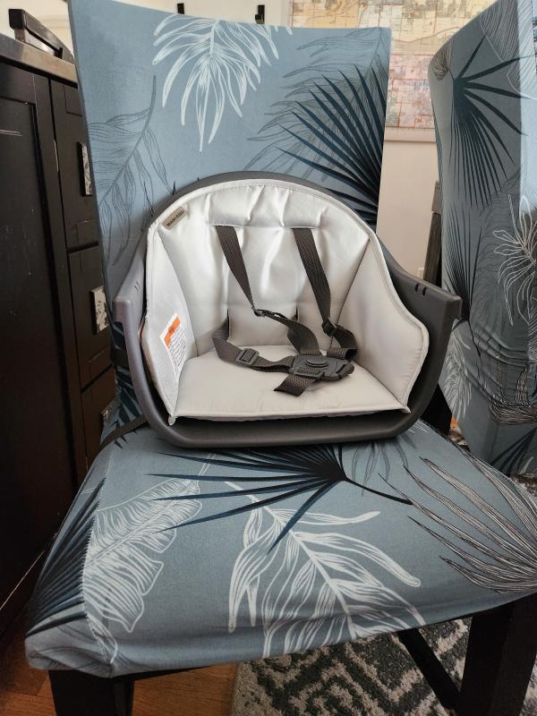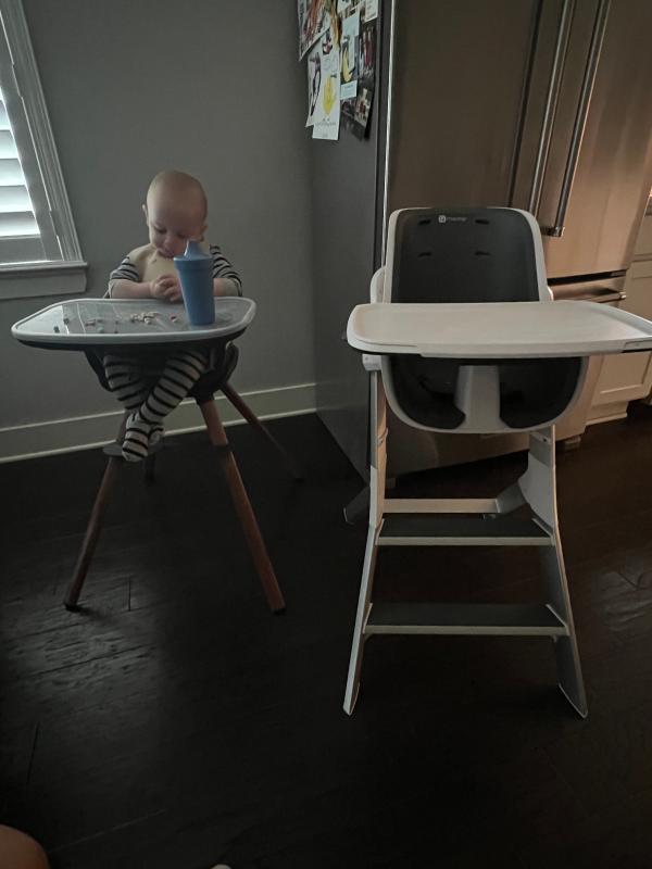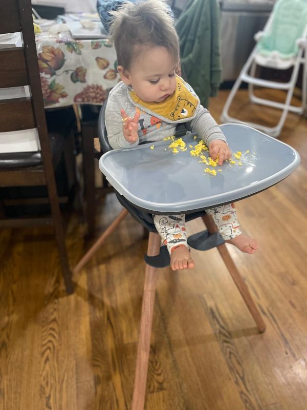 We liked the ease and simplicity of this high chair but when we started solids with our 6 month old I didn’t love the fact that her feet don’t have a platform because they’re too low for her to reach. The chair is so small and works great for younger babies but also doesn’t fit the needs for safe eating. Would not recommend for this reason! But we may like to use it as a toddler table in the future.