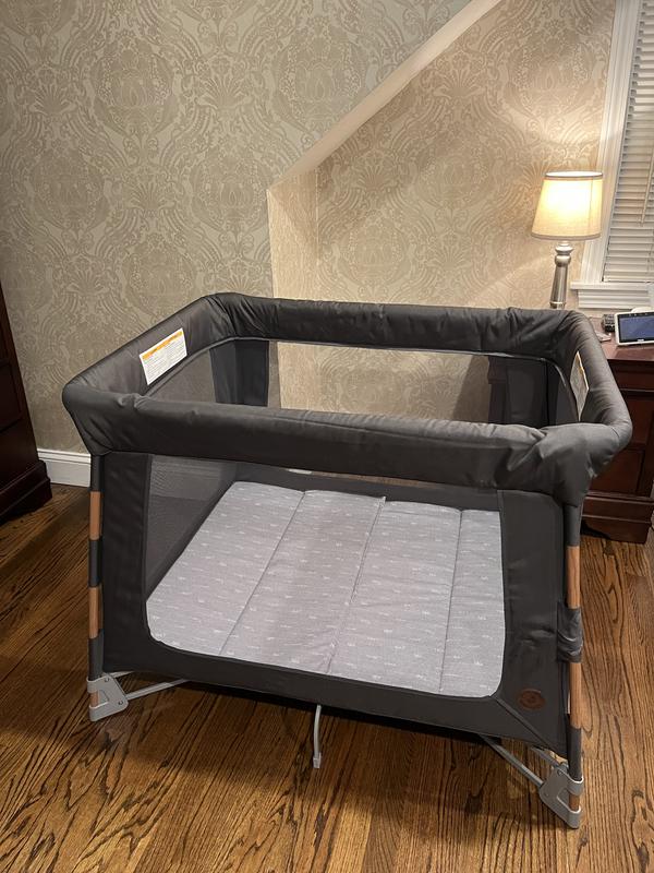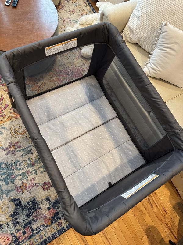 This play yard has been working great for us. The first thing that I noticed about it was the modern design. I really like the "wood" accents and nice fabrics. I think it makes it feel more like a piece of furniture than just baby gear. It's actually pretty lightweight and is really easy for me to move it easily from room to room, which is a big help when I'm juggling my baby and toddler. The thing I was by far the most surprised/delighted about with this play yard is how incredibly easy it was to set up. It just popped open and i pushed the floor down and that was it. I can literally open or collapse it with one hand while holding my baby. They did a great job figuring out how to make that work, clearly considering the needs of moms. I assume they did some serious mom testing to get that right, because it works perfect and is so easy, too. I was glad to see that it came with the bassinet option. It was so easy to follow the simple visual instructions and to set it up I just unzipped the mattress into two halves. When you unzip it, one half of it then fits perfectly in the newborn bassinet. Then I just have to zip the two parts back together to make a full-size mattress for the regular play yard. I’ve noticed the padding is thicker and softer than I had expected, so my baby is actually really comfy during naps. We use it in the living room while I'm cooking and we also use it a lot to bring with us for weekends at the grandparents (it comes with a nice travel bag). Getting lots of use out of this play yard! I received this product as part of the Stellar Product Testing Panel.