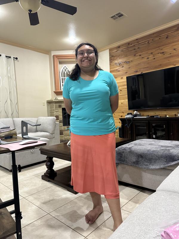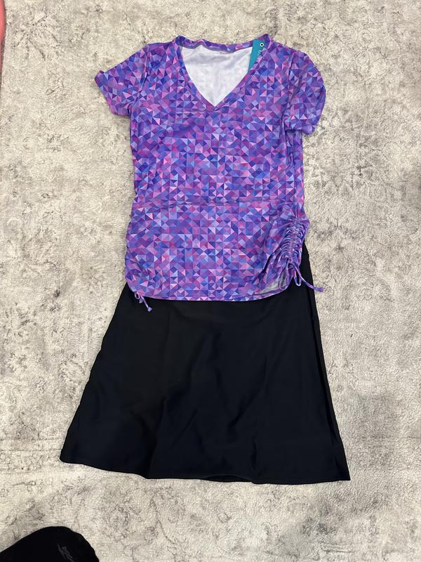 The Calypsa Womens Short Swim Skort has just the right amount of short and of skirt! It stays where it should when wearing in the pool and dries relatively quickly. I finally went into the pool feeling good and covered and not feeling like I need to hide!