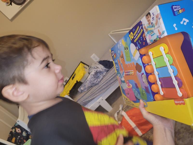 My son loves mega blocks so he enjoys helping me put this together and plus side he loves music! It is very cute and easy to put together he loves to play with it. It was made very well and I like the fact that there isn’t stickers on the faces on the blocks they are printed on so no stickers peal off. This toy will last a very long time. I give this product a 10/10.