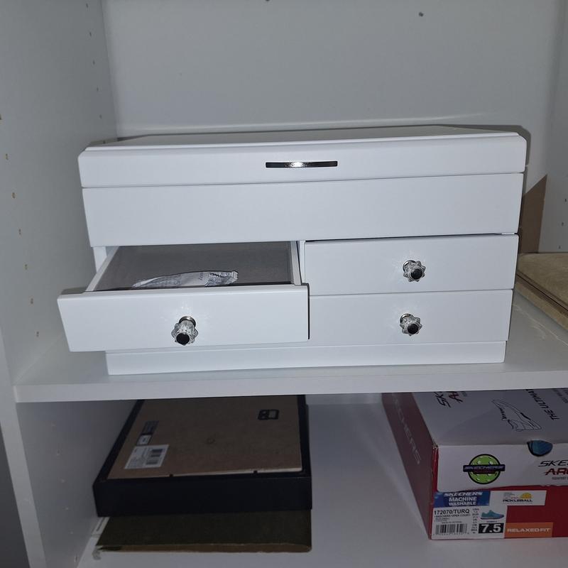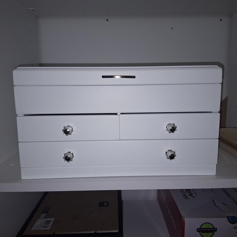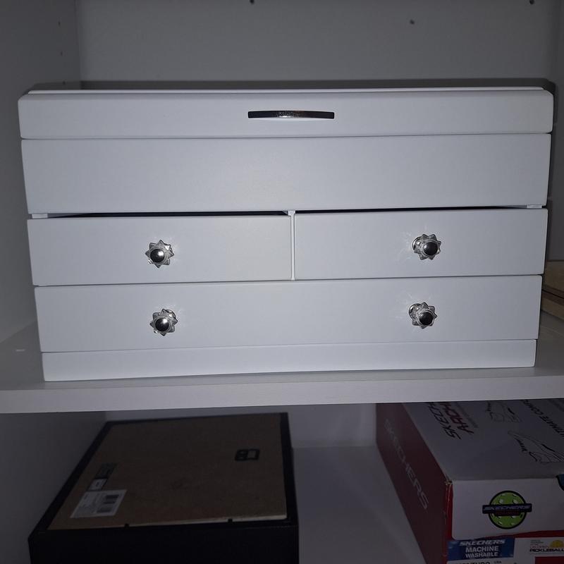 Jewelry box is poorly made. Drawers easily fall out and do not fit tightly into their slots. The two top drawers are not well aligned and look terrible. Product has been returned for credit already, but as a Macy's customer we are very disappointed in the quality and workmanship of this item.