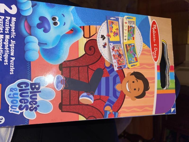 The blues clue take along jigsaw puzzle is a great travel item. It's magnetic so the pieces easily stick to the board. I would say it's more for a 4-5 year old since they pieces are a little small. Bit overall a great item to keep in the car for long car rides.