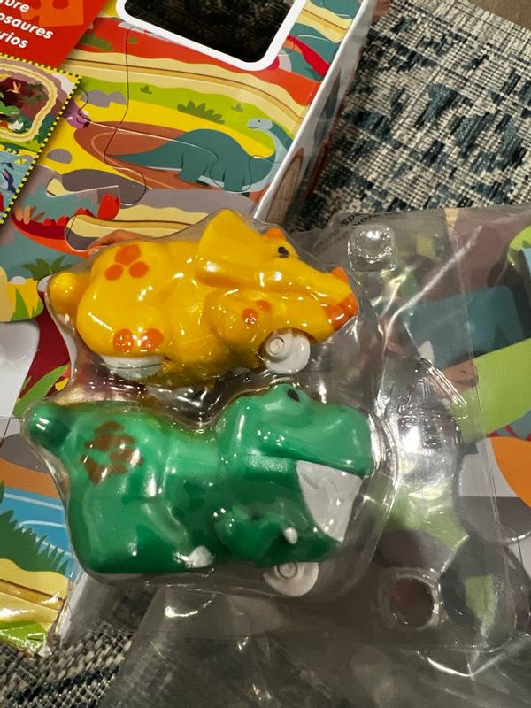 This was a great puzzle and my three year-old granddaughter had so much fun when she saw the wind up dinosaurs