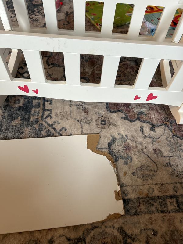 I received this for my daughter‘s birthday a few months ago and the bottom has already cracked into pieces. It is a cheap cardboard material unlike the rest of the crib. I called to ask if I could purchase a replacement and they said that they do not have any. So now I am stuck with the crib with no base. Product is essentially useless at this point