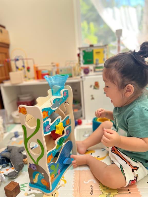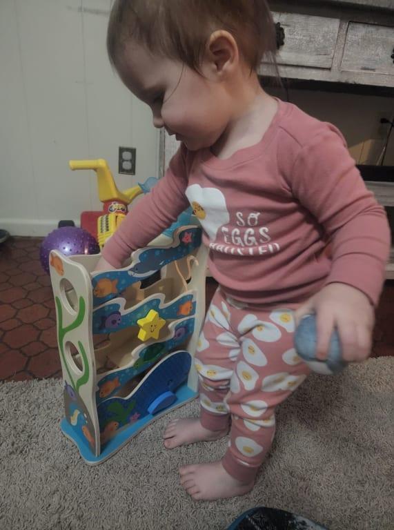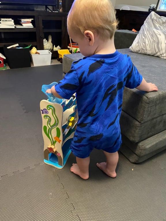 This toy is excellent in so many ways - it's colorful, sturdy & well made. Although I bought it for my 1 year old granddaughter, her 3 1/2 year old brother loves seeing the balls slide down & a 7 year old boy also enjoyed it.