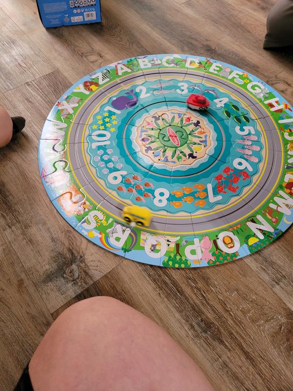 This puzzle is so much fun. It was fun to put together and it comes with 2 themes and 1 wind up vehicles. They each have a track they can run on around the inside of the puzzle. We have been playing when the vehicle stops we say what letter or number it lands on. It is such a fun learning puzzle.