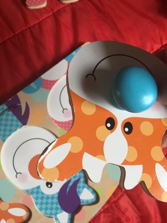 This is an awesome puzzle! Well made, colorful, great knobs for young child hands, and age appropriate challenge to get the piece in the right spot! Also provides opportunity to teach child name of animals and sounds they make. My granddaughter likes to take a knobbed piece in each hand and pound them together cymbal-style and they take the beating. M and D should be proud of this great child development supporting toy!