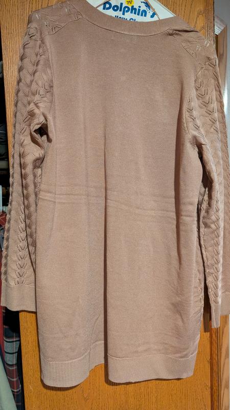 Bought XL petite. Long fit vs regular cardigan style. Nice feel and fit. Solid back with cutout sleeves and front. Lightweight