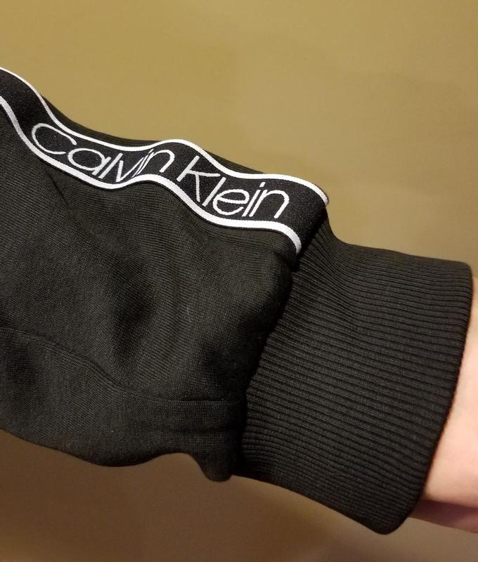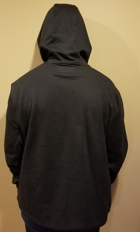 This Calvin Klein athletic hoodie is as pictured. It has the logo strip going down on the sleeves, with the lettering in a light gray color. It does have that long type of pocket going across the front. I like this type of athletic hoodie because it's not all completely polyester. It's 82% cotton and 18% polyester, so it doesn't have that full on polyester type of feel to it. I got a size small and fits good, not fitted it's a loose fit. It does fit a bit longer than I'd like. It's an athletic hoodie so it's great to work out in, or run in. I am a runner so this type of hoodie is great for me because I start to get hot once I get going. The hoodie is not thick, but it's cold, or cold and rainy out so works for me. There is no drawstring on this hoodie, which is fine with me. The color isn't the blackest of color, not faded, like a muted black color.
