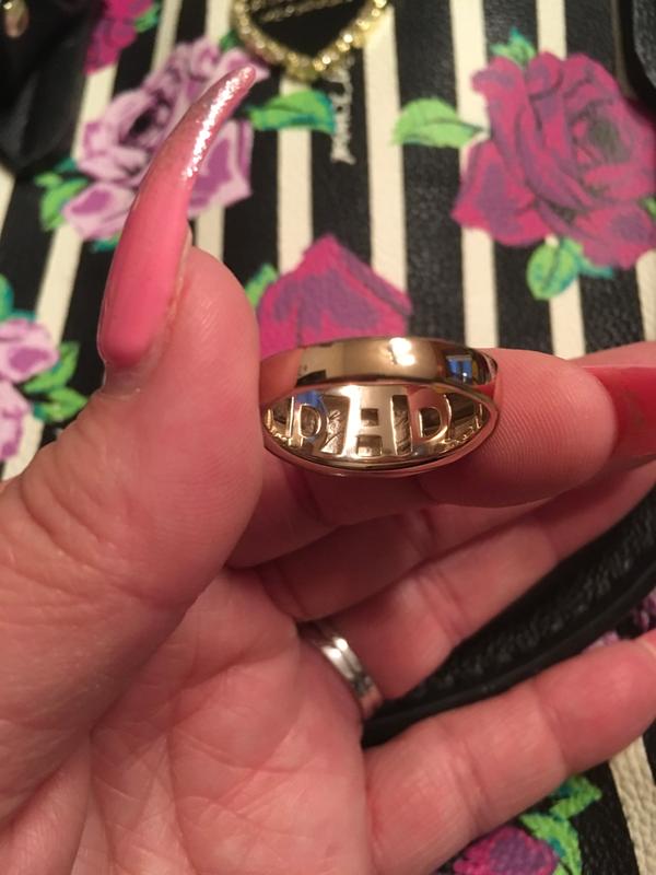 this ring was a father's day gift, looks great however after a week of wearing the ring the gold faded on the sides and bottom..so it looked like I was wearing a two toned ring. I know that it is a gold plated ring but I didn't think thank the gold would be so easily disfigured.