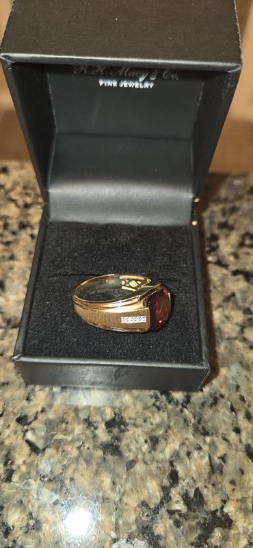 bought by my girlfriend for my birthday at over inflated cost of $1700. They told her it was 14kt. Obviously its not. Within 2 months the garnet is rattling in setting. Took it to Macys, and they said theyd have to ship it from east coast to califormia. Then they could tell me the cost of fixing. Took it to NYC diamond district and they told me even the diamonds was loose. Once again Macys jewelery fails.