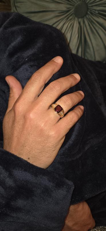 I bought this men’s ring with a garnet for my husband’s birthday, as January is his birth month. The ring is absolutely stunning, with diamond accents on the sides that add a special touch of elegance. It is 10 carats, and I was lucky to purchase it with a Christmas discount. I couldn’t wait to give it to my husband, and he was beyond happy. He wears it every day and says it feels like a true royal signet ring. I highly recommend this ring.
